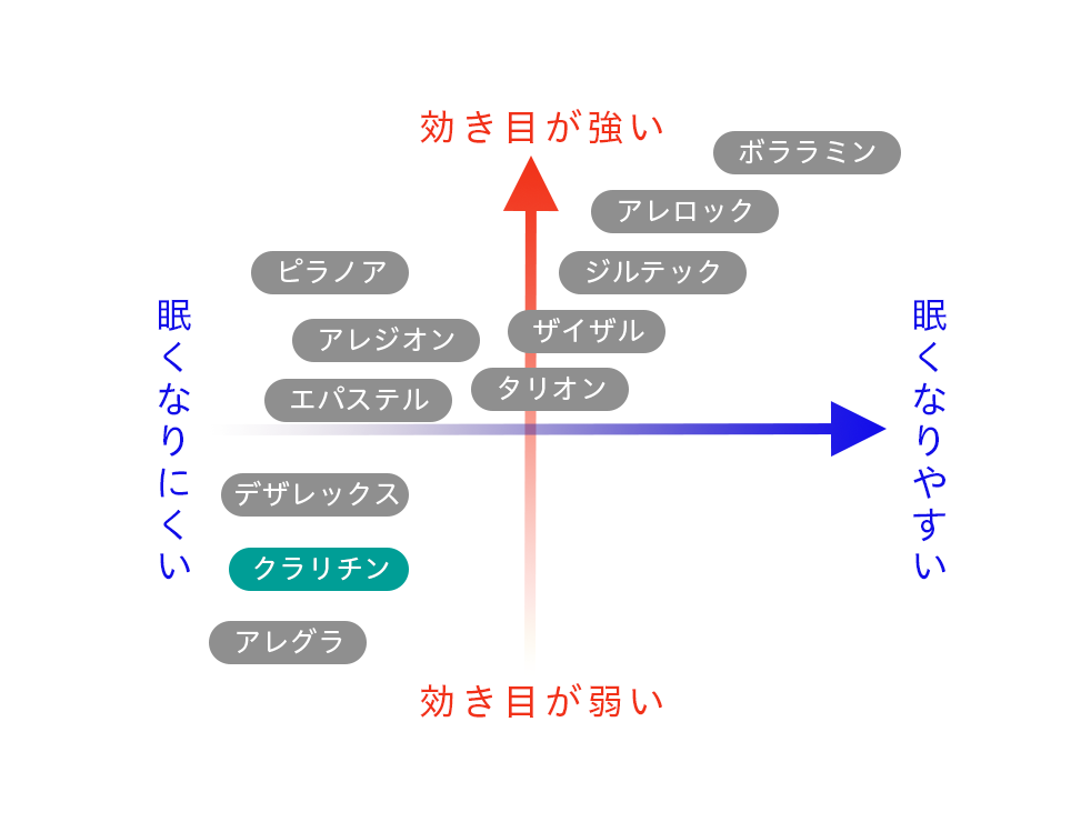 こちらの抗ヒスタミン剤などの抗アレルギー薬は患者様の症状によって強弱、強い薬またはマイルドに効く薬、