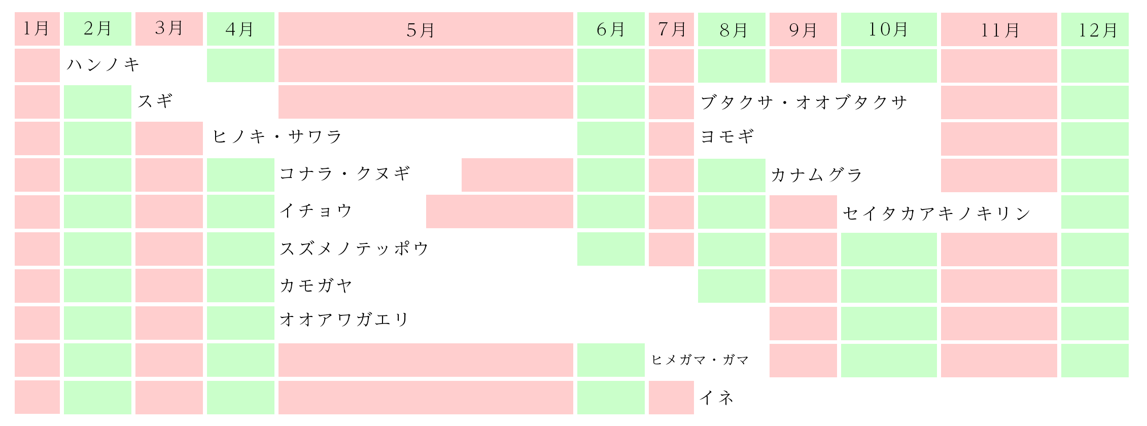 | ※ヒノキ | 日本特有の常緑針葉樹。3~5月が花粉のシーズンで、植林面積がスギを上回るところもあります。 |